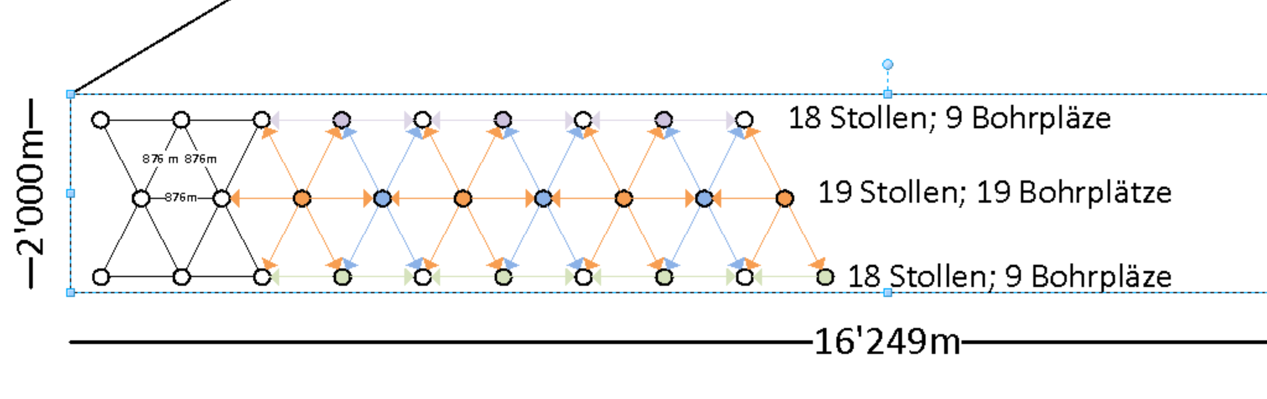 Die Slim Hole Bohrungen werden aus den Stollenbohrungen heraus gemacht. Die Slim Hole Bohrungen verbinden die Stollen horizontal, vertikal oder diagonal. Von der Mitte aus (also auf einer Tiefe von 9‘000 m) können 8 und 4 Slim Hole Bohrungen (orange / blau) gemacht werden. Oben (violett) und Unten (grün) können noch zwei Bohrungen von einem Bohrplatz aus gebohrt werden.