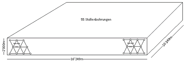Wie unter den Calculations berechnet, muss ca. 528 km3 Fels erschlossen werden. Bei den berechneten 4’396 Rohren, der Wärmetauscherhöhe von 2’000 m und den Rohrabständen von 450 m ergäbe dies etwa 55 Stollen / Tunnel à 16’249 m = 893’695 m, also 893.695 km. Auf den Tiefen - 8'000 Meter, - 9'000 Meter und - 10'000 Meter sind diese Stollen / Tunnel sternförmig (18° Abstand) angebracht. Auf jeder Tiefe müssten je 19 Stollen sein (gerundet). Diese sind 16’249 m lang. Damit wird eine gesamte Stollenlänge von 893.695 km erreicht.